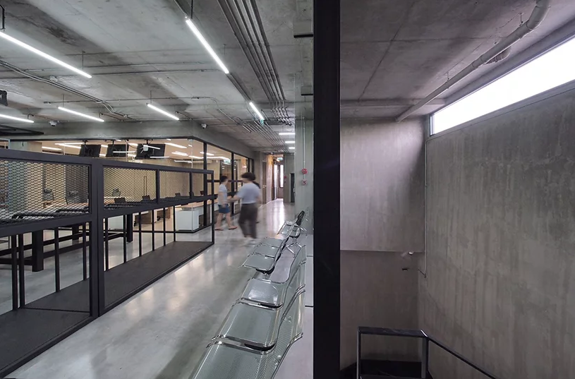 二樓辦公室裝修中充當皮革展示區和辦公空間。每層的窗戶隔片都是可以旋轉的,而且窗戶是凹進去的,這樣帶來的是間接的光線,不會損傷皮革制品。辦公區和展示區都是很寬大的,整體有著很濃的工業風格。