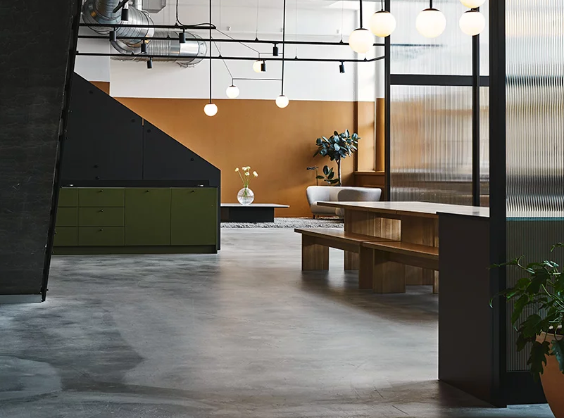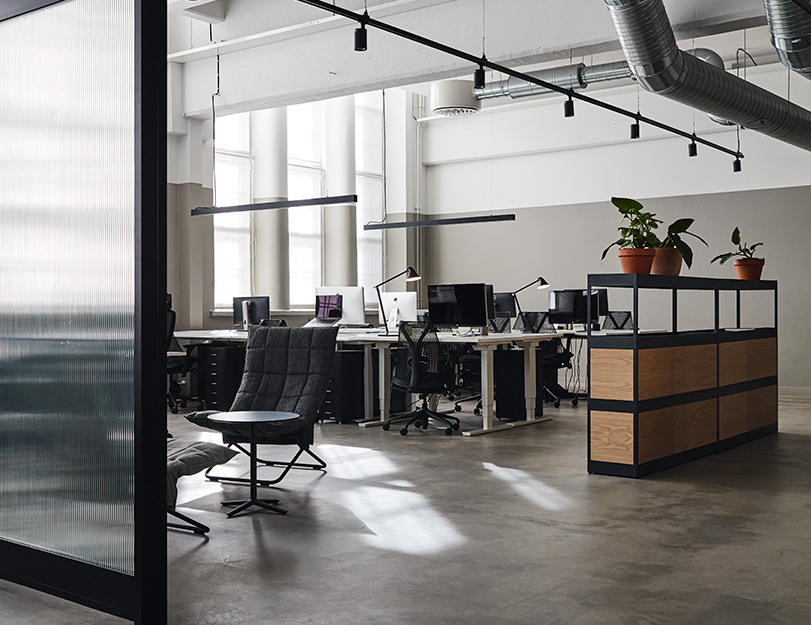 6米高的工業(yè)空間,辦公室裝修總面積1500平方米,分為公共和私人區(qū)域,以確保不同層次的互動(dòng)。在入口處,大堂和咖啡廳等公共空間鼓勵(lì)員工和顧客交往。會(huì)議室位于通向后方的長(zhǎng)廊上。這里和二樓閣樓上都是專門為員工提供的空間。