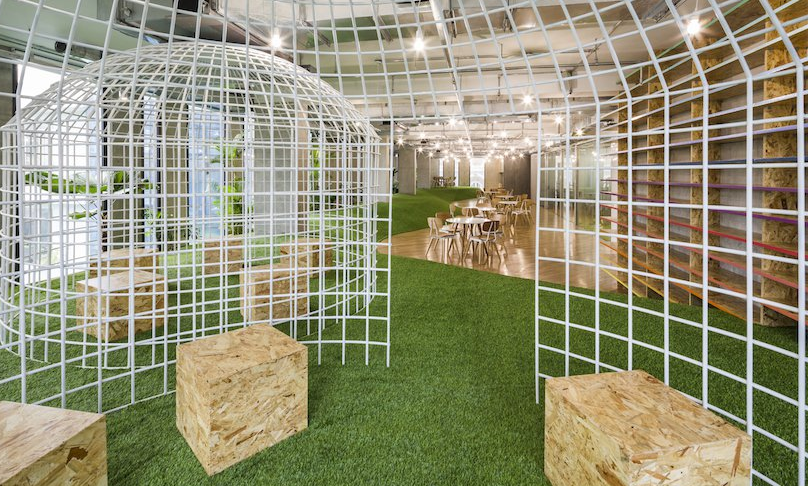 與暴露在外的混凝土地板形成鮮明對比的是,公司的標志采用了多色條紋,展示了一個由一群五顏六色的人建造的地球儀。在其他地方的辦公室裝修設計中,類似鳥籠的結構提供了非公開會議室的替代方案,并且可以移動以適應各種情況。